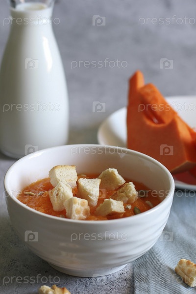 Белая миска с крем-супом из тыквы, гренками и семечками на светлом фоне