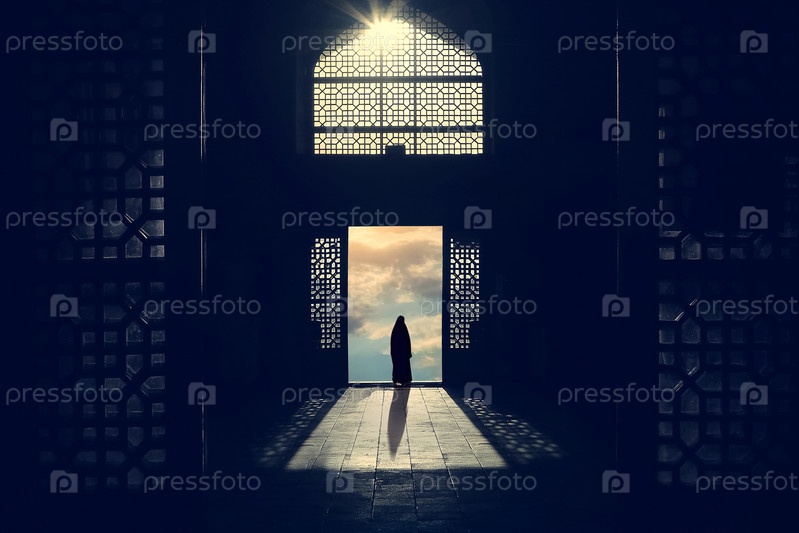 Силуэт мусульманки в хиджабе на фоне традиционной архитектуры и заката. Иран