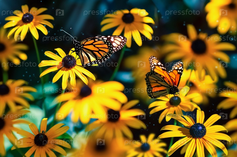 Желтые цветы и бабочки монарха. Летняя сказка. Зачарованный сад