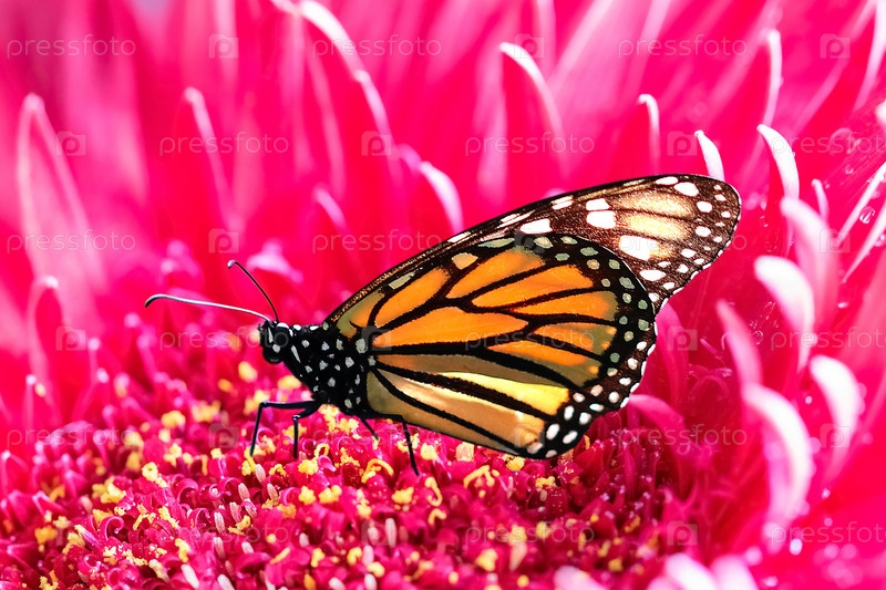 Бабочка монарх на фоне розовых лепестков. Летний макрофон