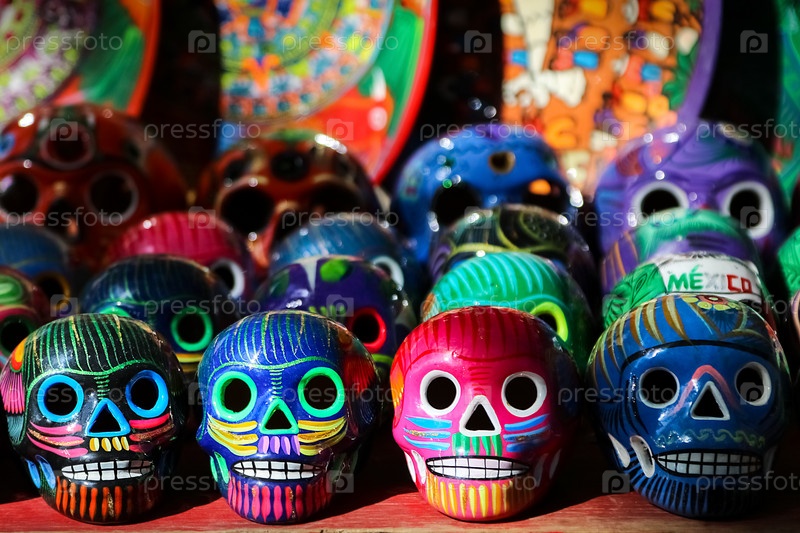 Традиционные мексиканские сувениры. Разноцветный керамический декоративный череп