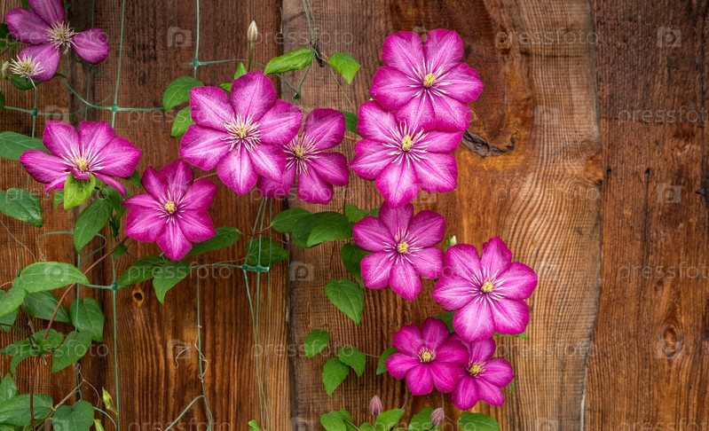 Ярко-розовые цветы клематиса сорта Ville de Lyon на фоне деревянной стены