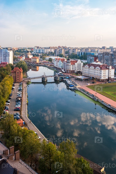 Раннее утро в Калининграде. Спокойная река Преголя с отражающим небом. Вид на Юбилейный мост и Рыбацкую деревню