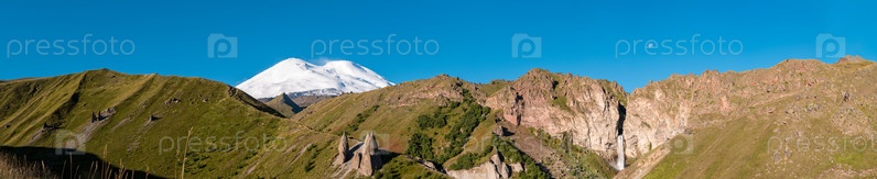 Кабардино-Балкария, Россия. Панорамный вид на гору Эльбрус и водопад Султан-Су с ясным голубым небом. Красивый пейзаж кавказских гор в осенний сезон