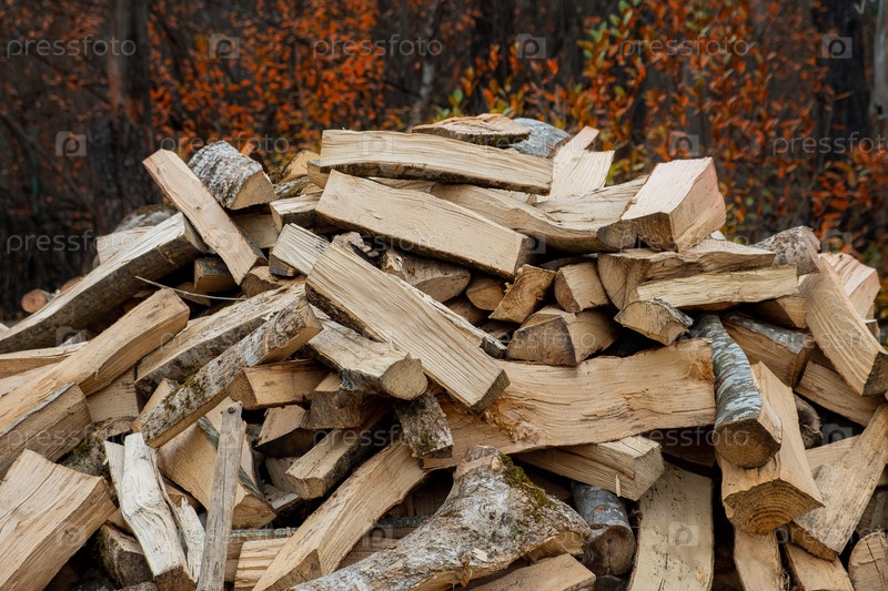 Нарезанные дрова для отопления лежат в куче среди деревьев