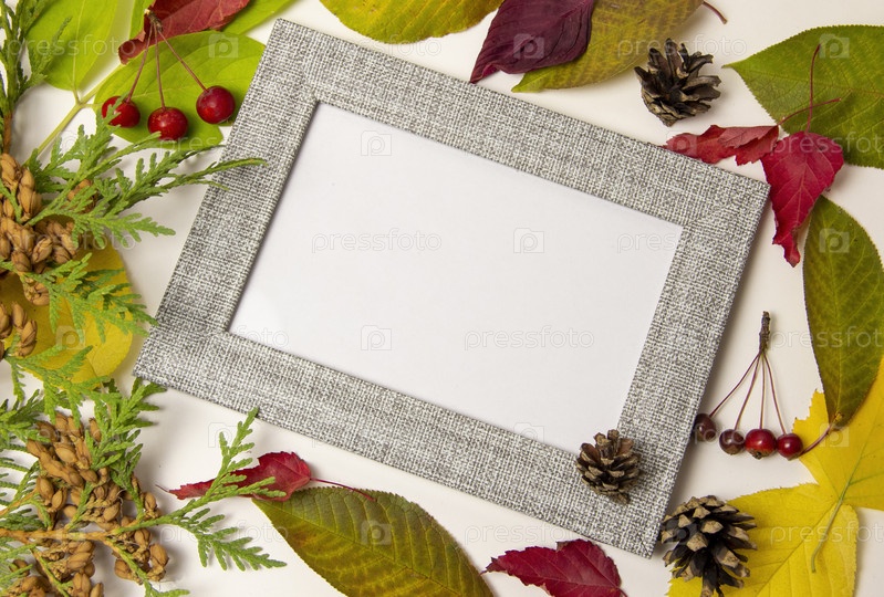 Осенний фон, вид сверху. фоторамка с белым чистым листом возле желтых осенних листьев