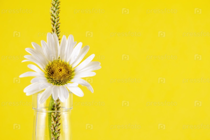 Белая ромашка на зеленом стебле стоит в стеклянной бутылке вместе с зеленым цветком подорожника, желтый фон, яркий желто-белый крупный план ромашки, место зеленого подорожника для текста