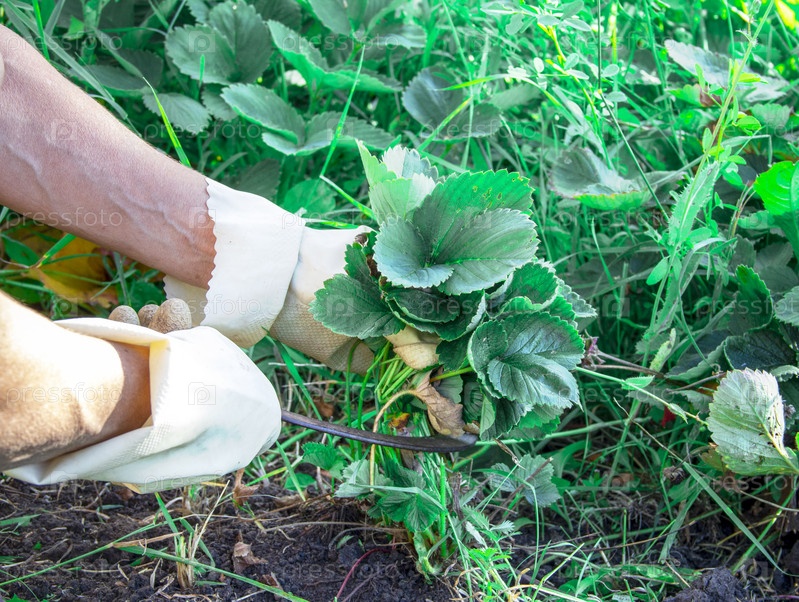 Садоводство, огород, дача. женские руки в бежевых перчатках срезают клубничный куст серпом