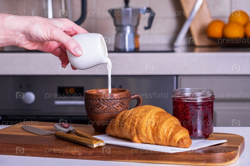 Свежий хрустящий круассан, джем и чашка кофе со сливками в женской руке