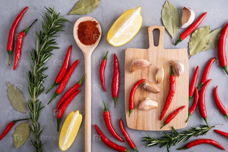 Стручки красного острого перца среди других специй на серой поверхности