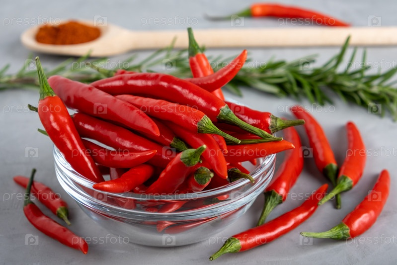 Стручки красного острого перца в стеклянной миске, розмарин и специи