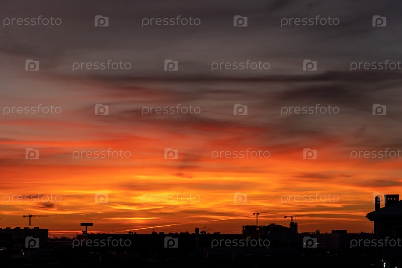 Красное облачное небо, восход солнца в декабре на юге России