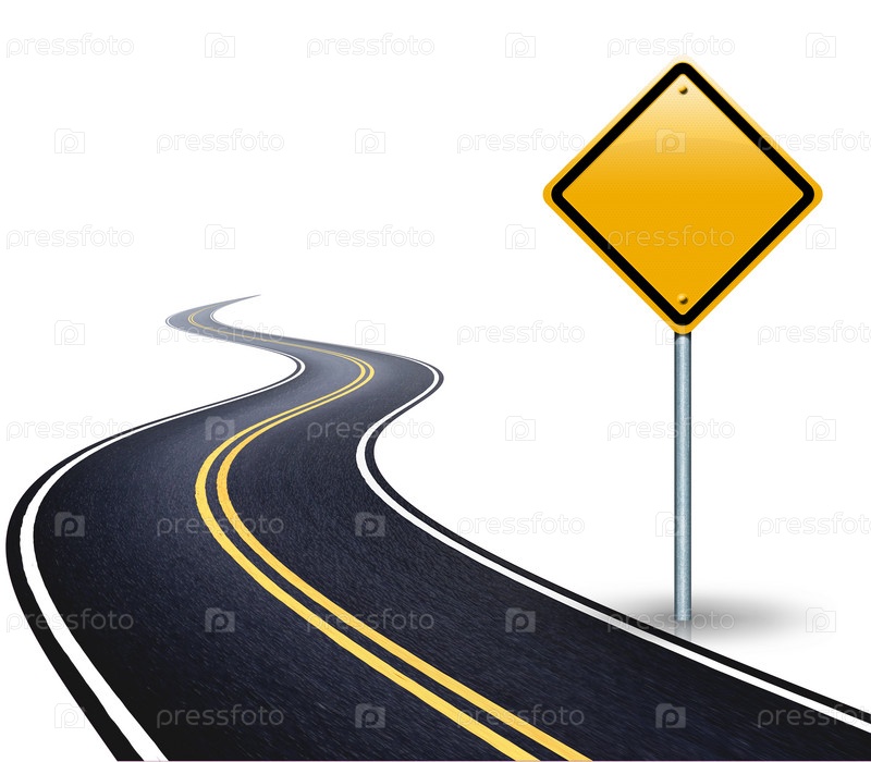 Извилистая дорога и пустой дорожный знак сбоку на белом фоне