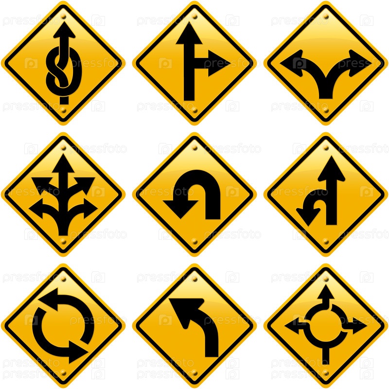 Ромбические желтые дорожные знаки со стрелками выбирают направления пути