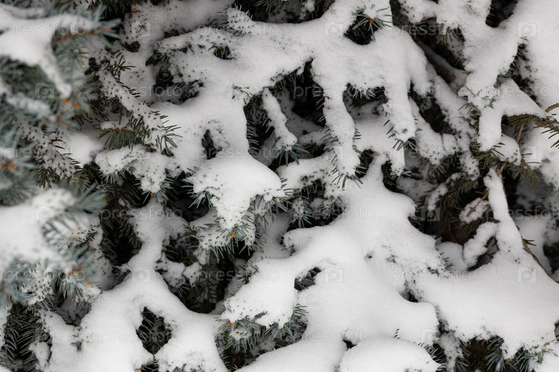 Первый снег на еловой ветке крупным планом. снежные шапки на ветвях ели. новогодний фон для дизайна