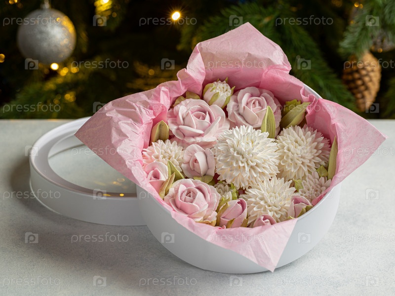 Зефирный букет цветов в подарочной коробке на светлом фоне. концепция новогоднего праздника. Зефир с минимальным количеством сахара. натуральный продукт