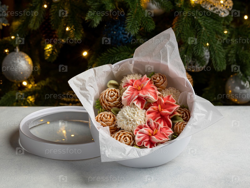 Зефирный букет цветов в подарочной коробке на светлом фоне