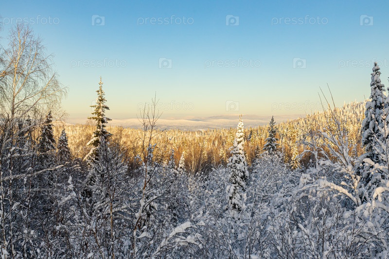 Заснеженный лес в тайге в зимний день. красивый пейзаж зимнего хвойного леса. заснеженные ели