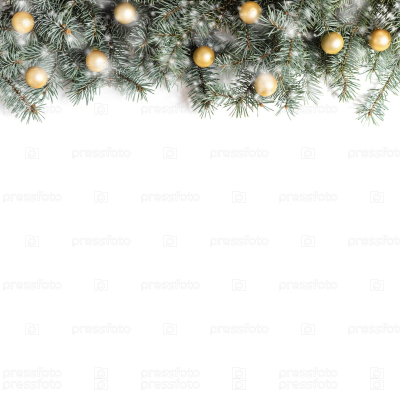Рождественская граница с еловыми ветками, золотыми шарами и снегом на белом фоне. Зимняя концепция. Вид сверху. Скопируйте пространство