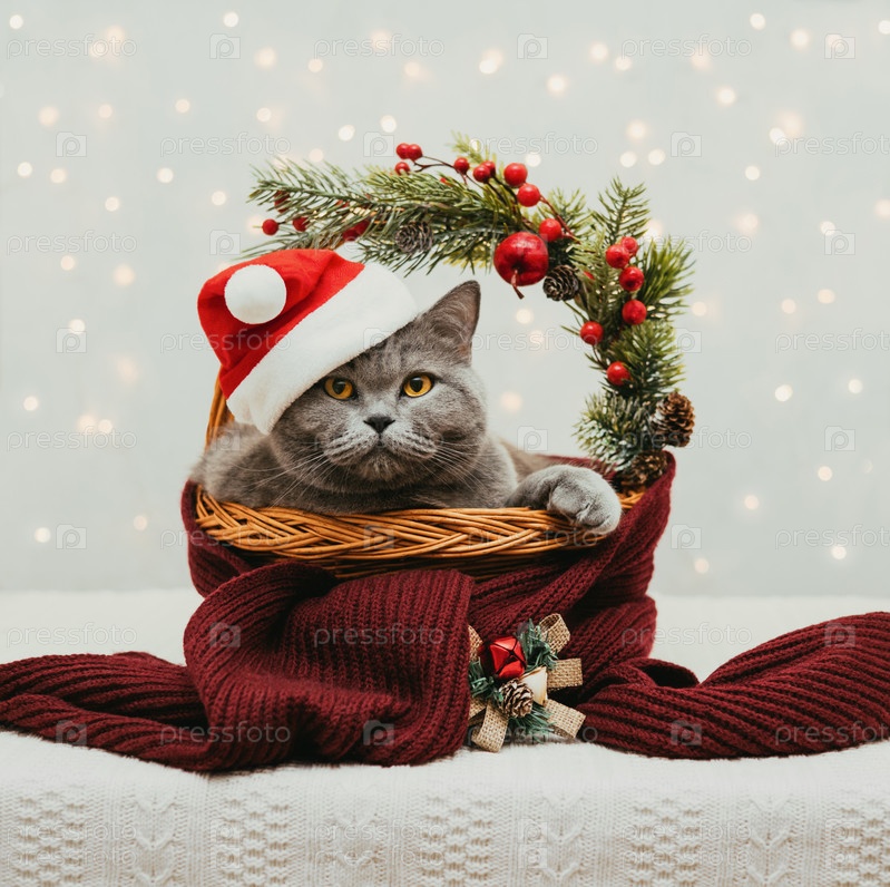 Британский кот в шляпе Санты лежит в рождественской корзине с праздничным декором. Новогодняя и зимняя открытка