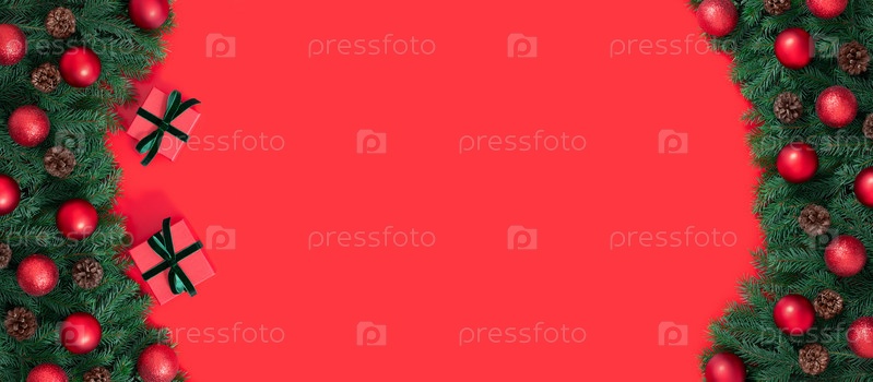 Рождественская рамка с подарками, шишками, безделушками и еловыми ветками на красном фоне. С Новым Годом. Открытка. Скопируйте пространство, вид сверху, плоская планировка. Баннер