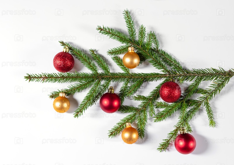 Новогодний фон с еловыми ветками, золотыми и красными шарами. Плоская планировка, вид сверху, пространство для копирования. Рождественские украшения на белом фоне