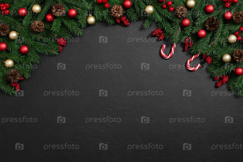 Рождественская арка с еловыми ветками, красным и золотым декором и карамельной тростью на черном фоне. С Новым Годом. Открытка. Скопируйте пространство, вид сверху, плоская планировка