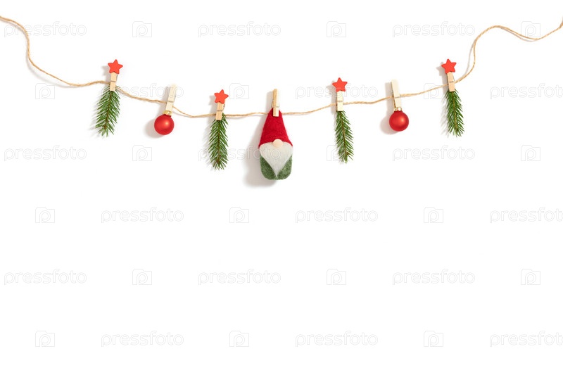 Рождественская гирлянда на веревке с еловыми ветками, безделушками и Сантой на белом фоне. Праздничная открытка с местом для текста