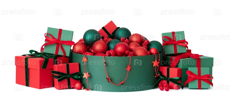 Рождественская композиция с подарками и праздничным декором на белом фоне. Красные и зеленые рождественские украшения. С Новым Годом