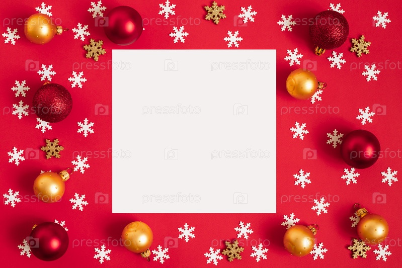 Рождественский макет со снежинками и золотыми и красными шарами на красном фоне. С Новым Годом. Место для текста. Зимняя концепция