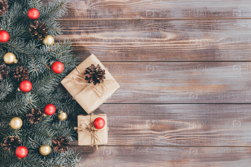 Рождественская граница с подарочными коробками и праздничными украшениями на деревянном фоне. Еловые ветки, шишки и красные, золотые безделушки. Новогодний декор. Скопируйте пространство, вид сверху, плоская планировка