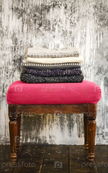 Куча вязаных теплых серых и белых одеял, шарфов и шерстяных свитеров на зиму или осеннюю холодную погоду на белом стуле возле бело-серой стены