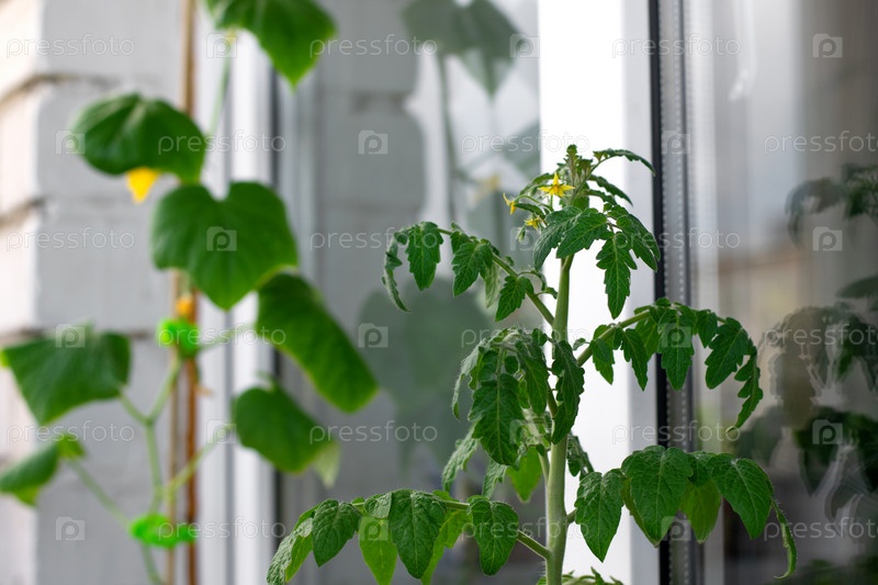 Помидор в цвету на застекленном балконе. Выращивание самоопыляющихся овощей в домашних условиях. Оконная ферма