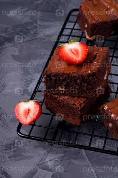 Кусочки шоколадного пирожного с орехами и клубникой на охлаждающей стойке на сером столе. Домашний десерт