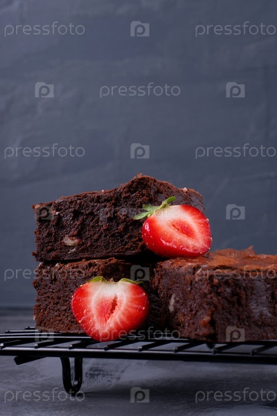 Кусочки шоколадного пирожного с орехами и клубникой на охлаждающей стойке на сером столе. Домашний десерт. Копировать пространство