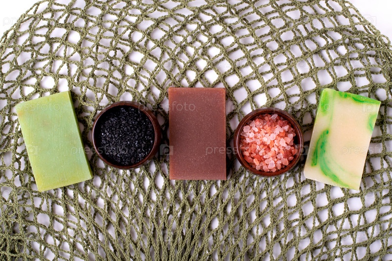 Мыло с натуральными ингредиентами, черная и розовая соль для ванн на сетчатом мешочке. Концепция экологически чистых и органических средств по уходу за телом и гигиены. Плоская планировка со спа-набором
