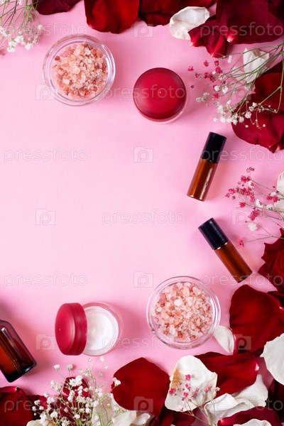 Ассортимент косметических товаров с лепестками роз и гипсофилой на розовом фоне. Увлажняющий крем, роликовая бутылка и гималайская соль для ванн обрамляют пространство для копирования. Макет с косметической вариацией