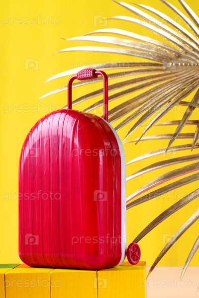 Красный чемодан и золотые пальмовые листья на желтом фоне. Концепция путешествий и летних каникул