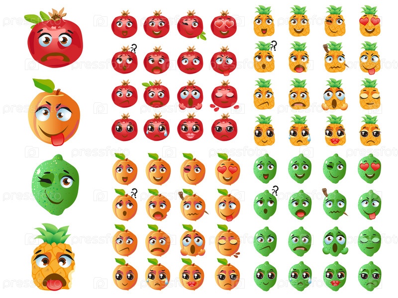 Набор векторных наклеек, смайликов с милым персиком, ананасом, гранатом, лаймом