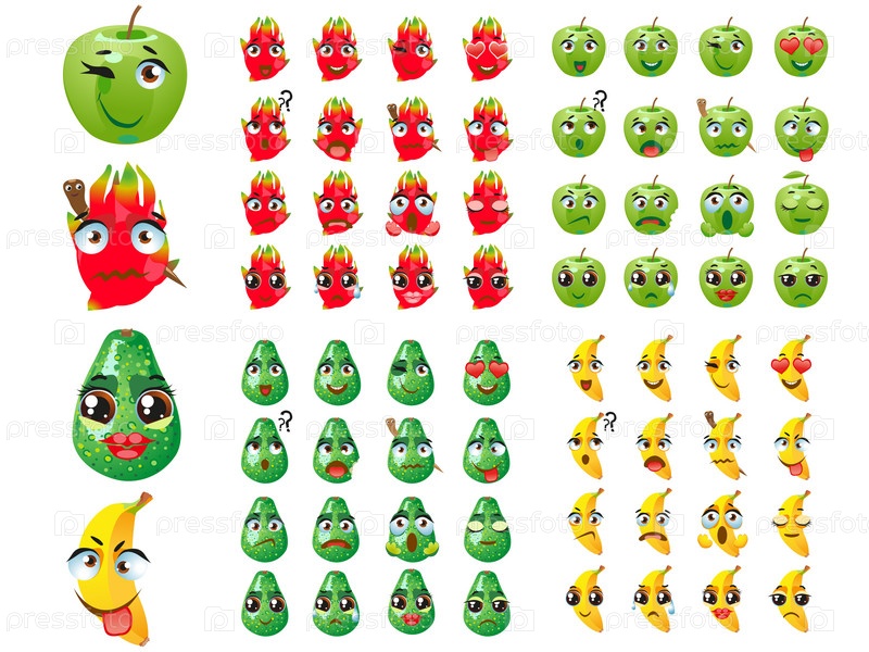 Набор векторных наклеек, смайликов с милой питайей, бананом, яблоком, грушей