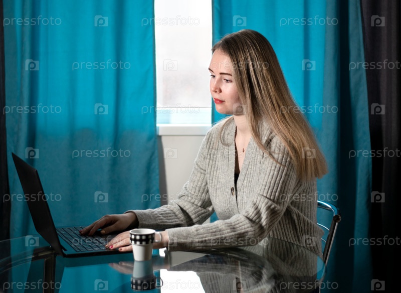 Молодая женщина со светлыми волосами работает на своем ноутбуке дома у окна. Работа и обучение онлайн. Внештатные вакансии. Использование технологий для ведения бизнеса