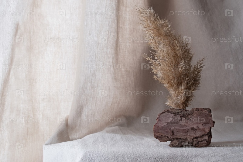 Естественный фон для эко-продуктов. Лен, кора дерева, зеленое и сухое растение, подиум