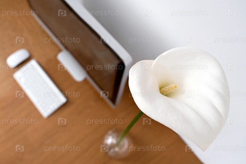 Рабочее место в минималистичном стиле. Монитор, клавиатура и мышь на деревянном столе рядом с домашним цветком и лилиями каллы. Скопируйте пространство