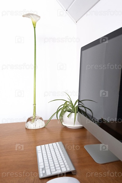 Рабочее место в минималистичном стиле. Монитор, клавиатура и мышь на деревянном столе рядом с домашним цветком и лилиями каллы. Скопируйте пространство