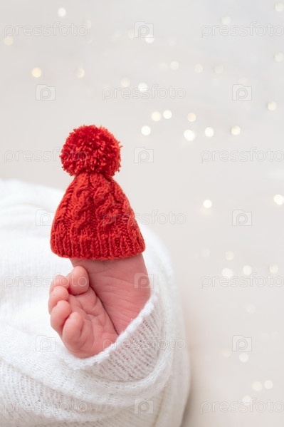 Ножки новорожденного с рождественскими украшениями в шапке. Забавная милая маленькая красная шапка Санты на детской ножке. новый год 2022