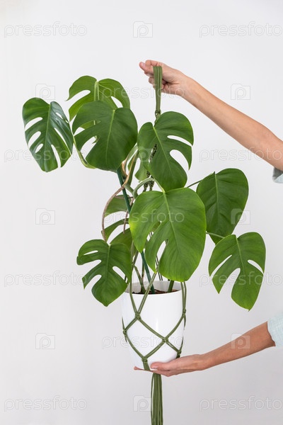 Зеленые вешалки для растений макраме ручной работы с растением в горшке висят на руке женщины. горшок и монстера плане