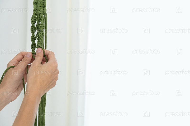 Зеленые вешалки для растений макраме ручной работы с растением в горшке висят на руке женщины. горшок и монстера плане