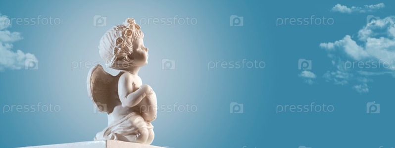 Ангел Купидон на подиуме с сердцем на фоне неба с облаками. День Святого Валентина