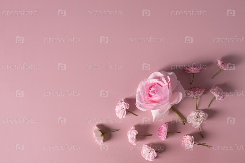 Шаблон для романтической поздравительной открытки с мягкими пастельными розовыми розами на розовом фоне. Цветочная рамка из розовых цветущих цветов. Нежно цветущие праздничные светлые розы