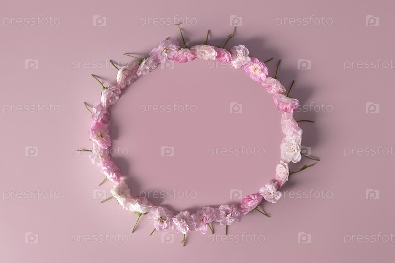 Шаблон для романтической поздравительной открытки с мягкими пастельными розовыми розами на розовом фоне. Цветочная рамка из розовых цветущих цветов. Нежно цветущие праздничные светлые розы